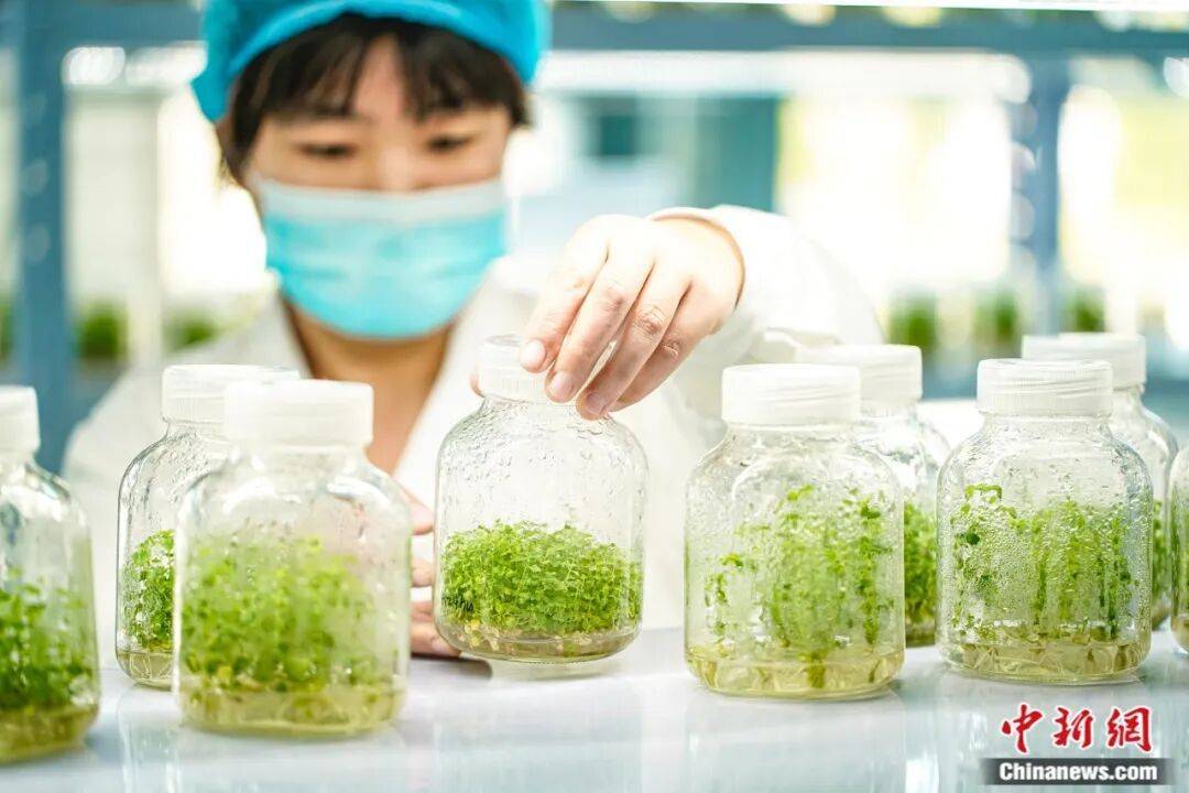 在安国现代中药农业园区内,工作人员正在查看中药材幼苗培育情况。安国市官方供图