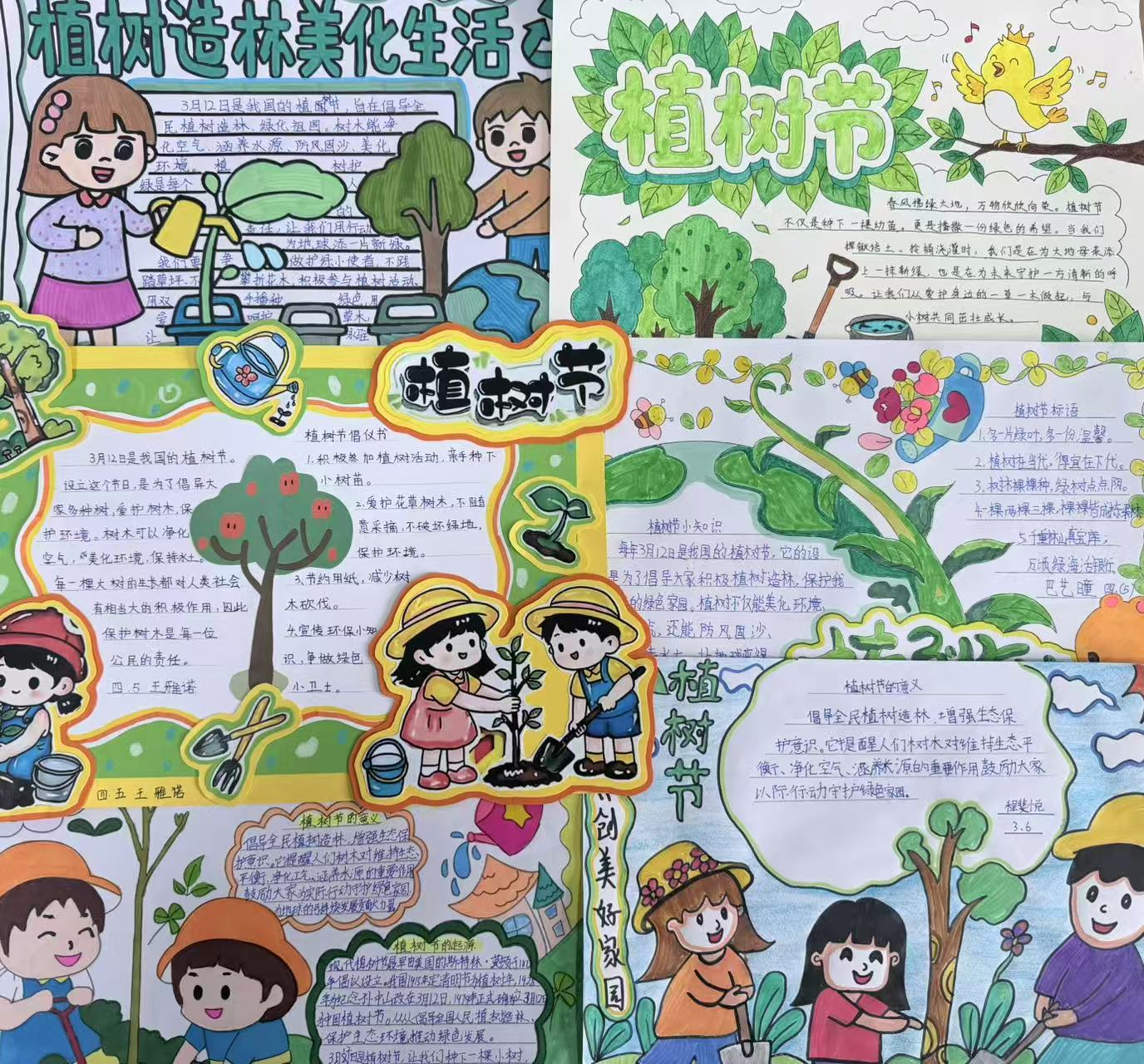 本次活动按年级分层设计,让绿色教育更贴合学生成长特点:一年级开展“种植心愿树”主题活动,孩子们亲手播撒种子,许下与小树共成长的美好愿望;二年级学生以植树节为灵感,创作充满童趣的小诗,用文字描绘春日生机;三至五年级学生则精心制作植树节主题手抄报,通过图文结合的形式,普及植树知识、传递环保理念。